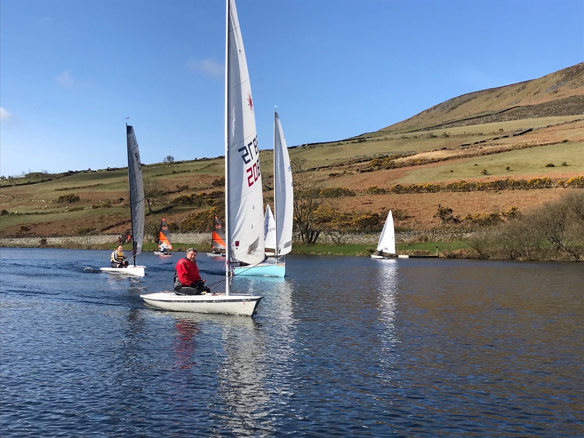 The final round of the Watling Streetworks 2018/2019 Winter Dinghy Series took place on Sunday morning at West Baldwin Reservoir. A good forecast of bright sun and spring-like temperatures brought out a good fleet of 12 crews. The wind, however, was from the East and with the Baldwin valley running north/south was just a bit confused, down the valley at the top, up the valley in the bottom, round in circles in between and don’t forget those vicious calms too! Read on for the full report – Watling Streetworks Winter Series – 31 March 2019