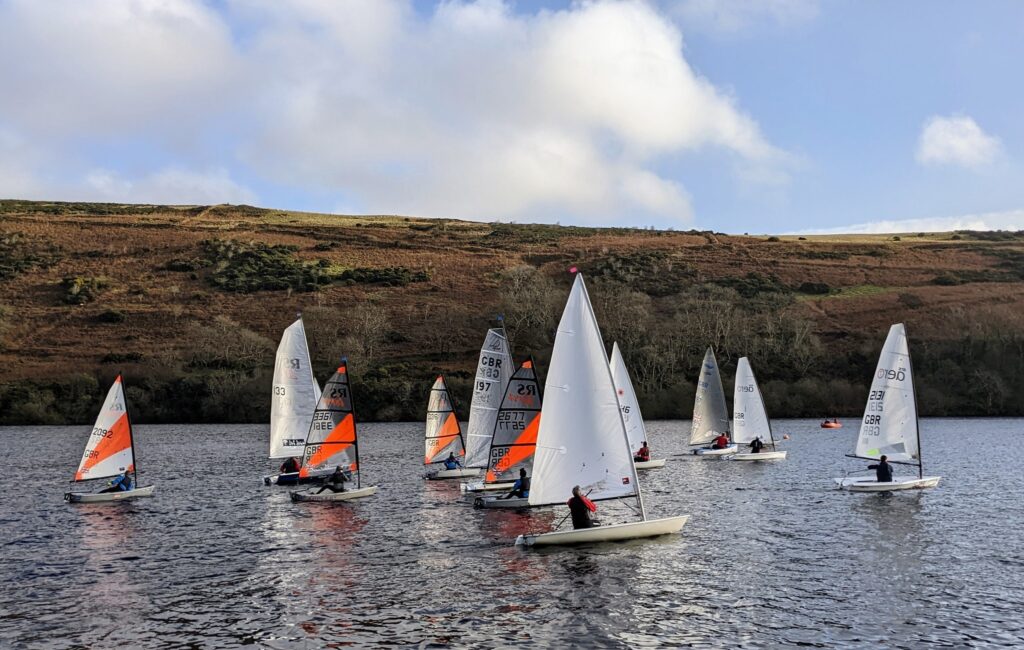 Despite there being Force 5 or 6 winds, gusting 7 in the Irish Sea, there was absolutely no wind at the reservoir when the fleet arrived to rig the dinghies on Sunday morning. However, an unusual degree of patience displayed by the fleet was rewarded after half an hour when a decent 5 knot breeze arrived with a few gusts from the south to test the unwary. A fleet of 12 boats launched consisting of 2 RS Aero7’s, 2 Laser standards, and one each Finn, Devoti D-Zero and RS200. The most numerous class was the RS Teras with 3 Pro and 2 Sport, the juniors all set to embarrass the seniors.