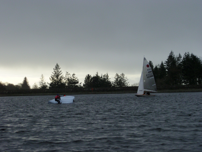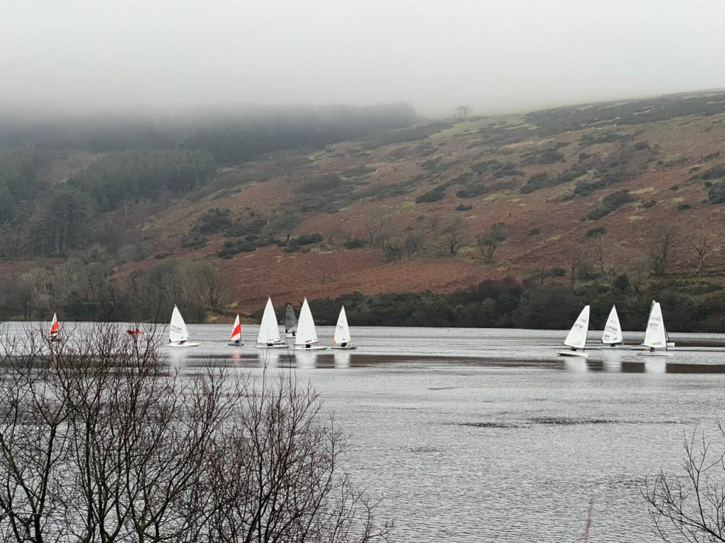 A South Easterly forecast with rain could have put a few off especially those who know what a mess it can make of the breeze on the lake but after a little hesitation from the older hands, youth took over and a fleet of 13 dinghies set off up the lake for the start line through the gusts, lulls, shifts and showers.